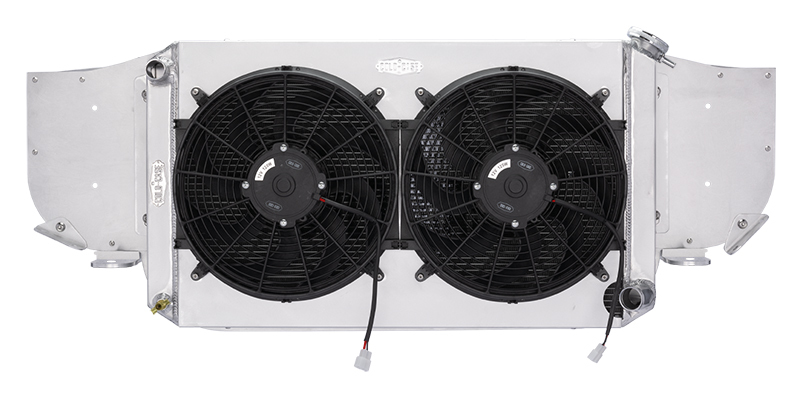 Radiator and Fan – 31.25 in W x 18.5 in H x 3 in D – Driver Side Inlet – Passenger Side Outlet – A/C Condenser / Radiator Support Included – Aluminum – Polished – Chevy V8 – GM F-Body 1967-69 – Kit