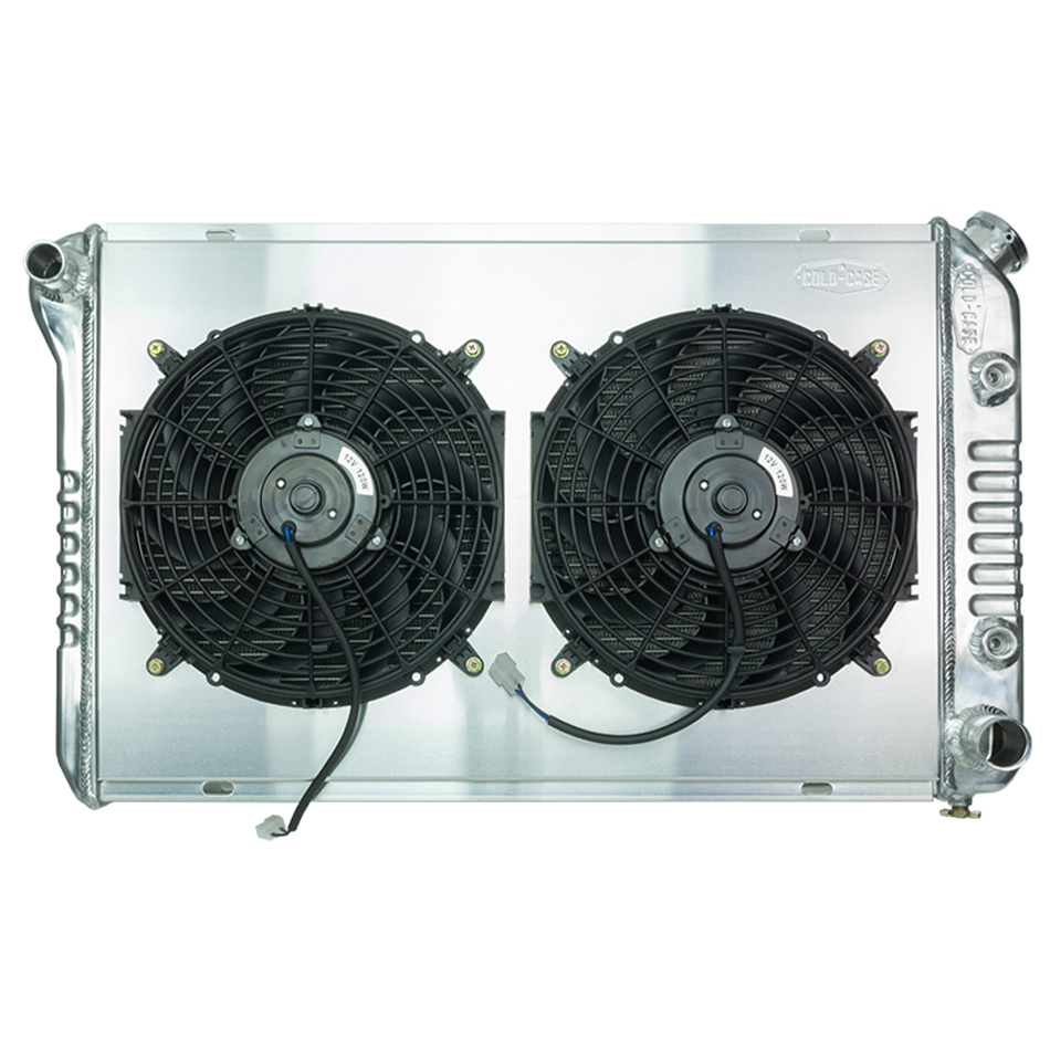 Radiator and Fan – 32 in W x 18.5 in H x 3 in D – Dual Fans – Driver Side Inlet – Passenger Side Outlet – Aluminum – Polished – Automatic – GM G-Body 1984-87 – Kit