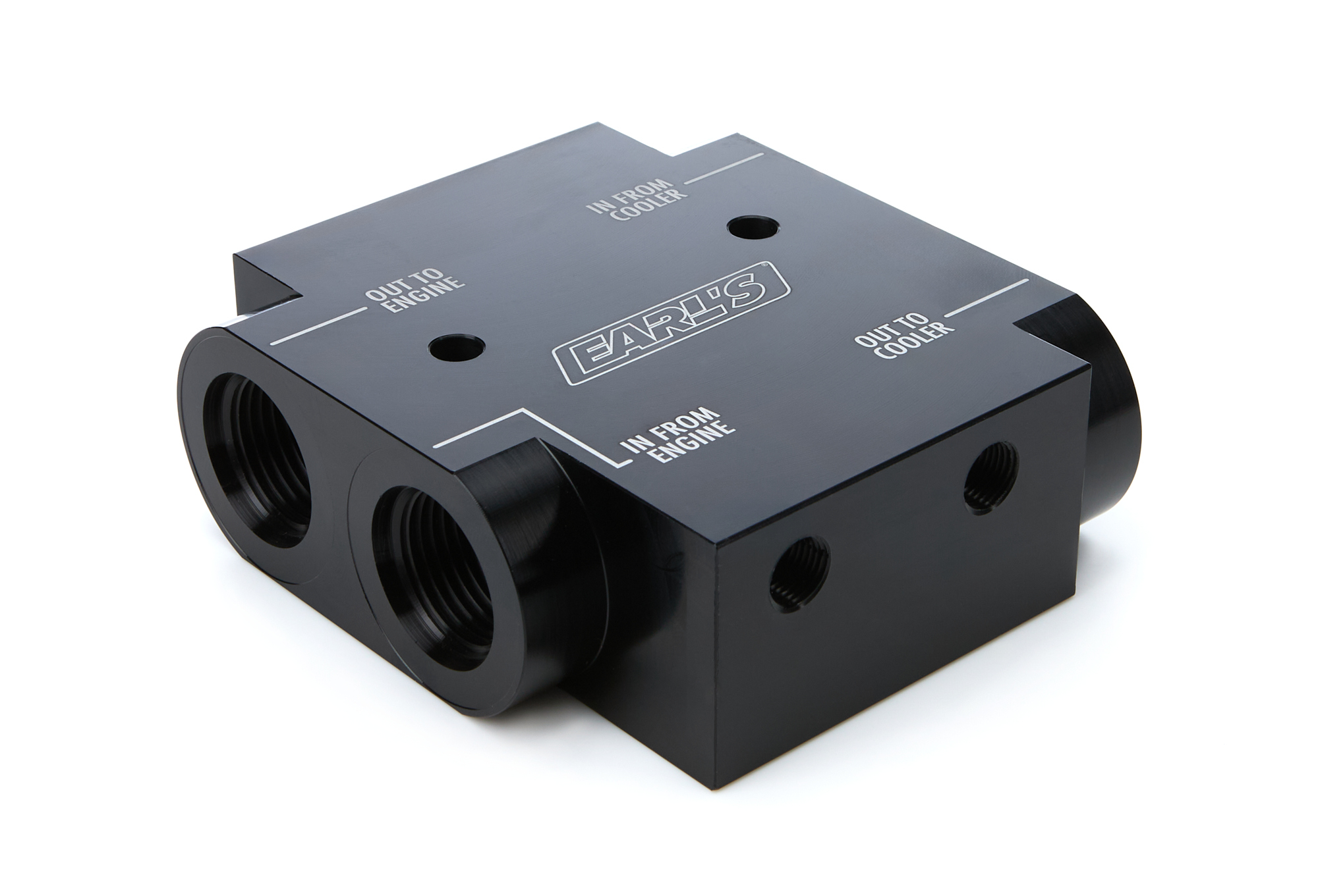 Remote – Dual 10 AN Female O-Ring Inlet – 10 AN Female O-Ring Outlet – 1/4 in Mounting Holes – Aluminum – Black Anodized – Each