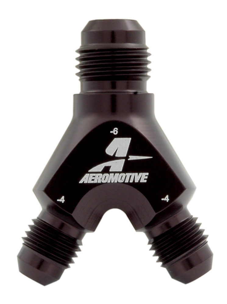 Fitting – Y Block – 6 AN Male Inlet – Dual 4 AN Male Outlets – Aluminum – Black Anodized – Each